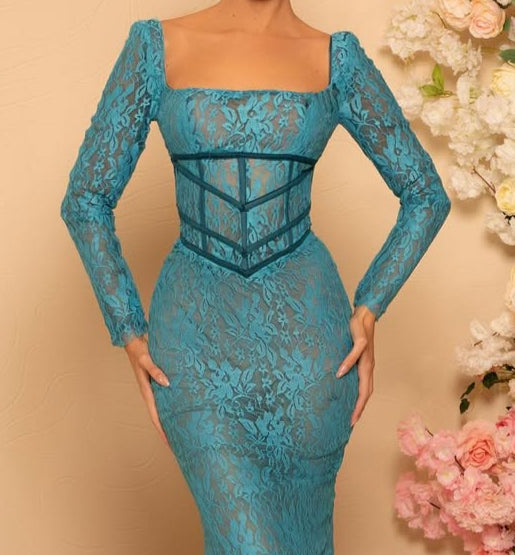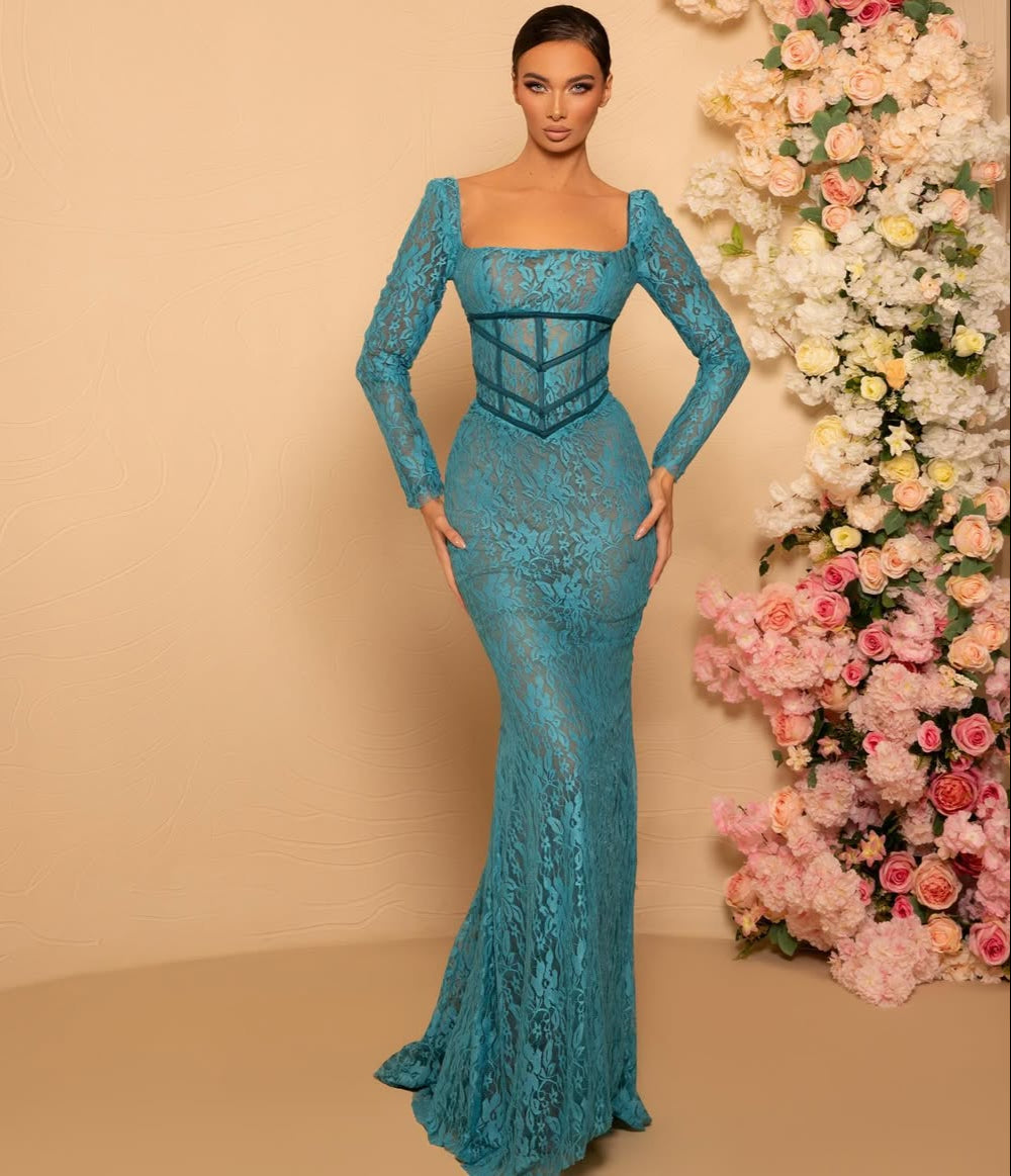 Sleek and commanding, this full-length teal gown hugs the figure in floral lace, while the structured square neckline and sheer boned corset create a strong, statuesque shape.