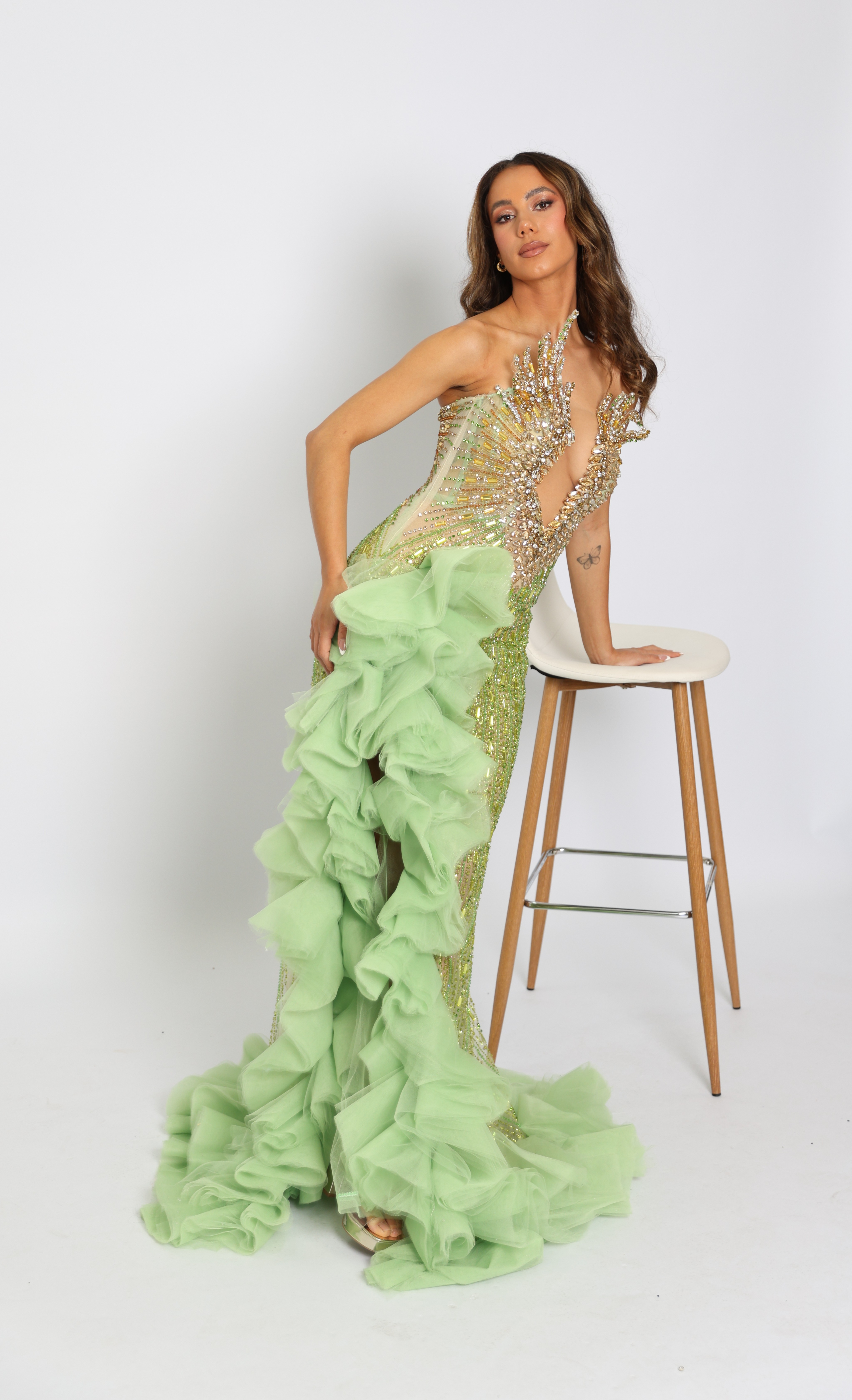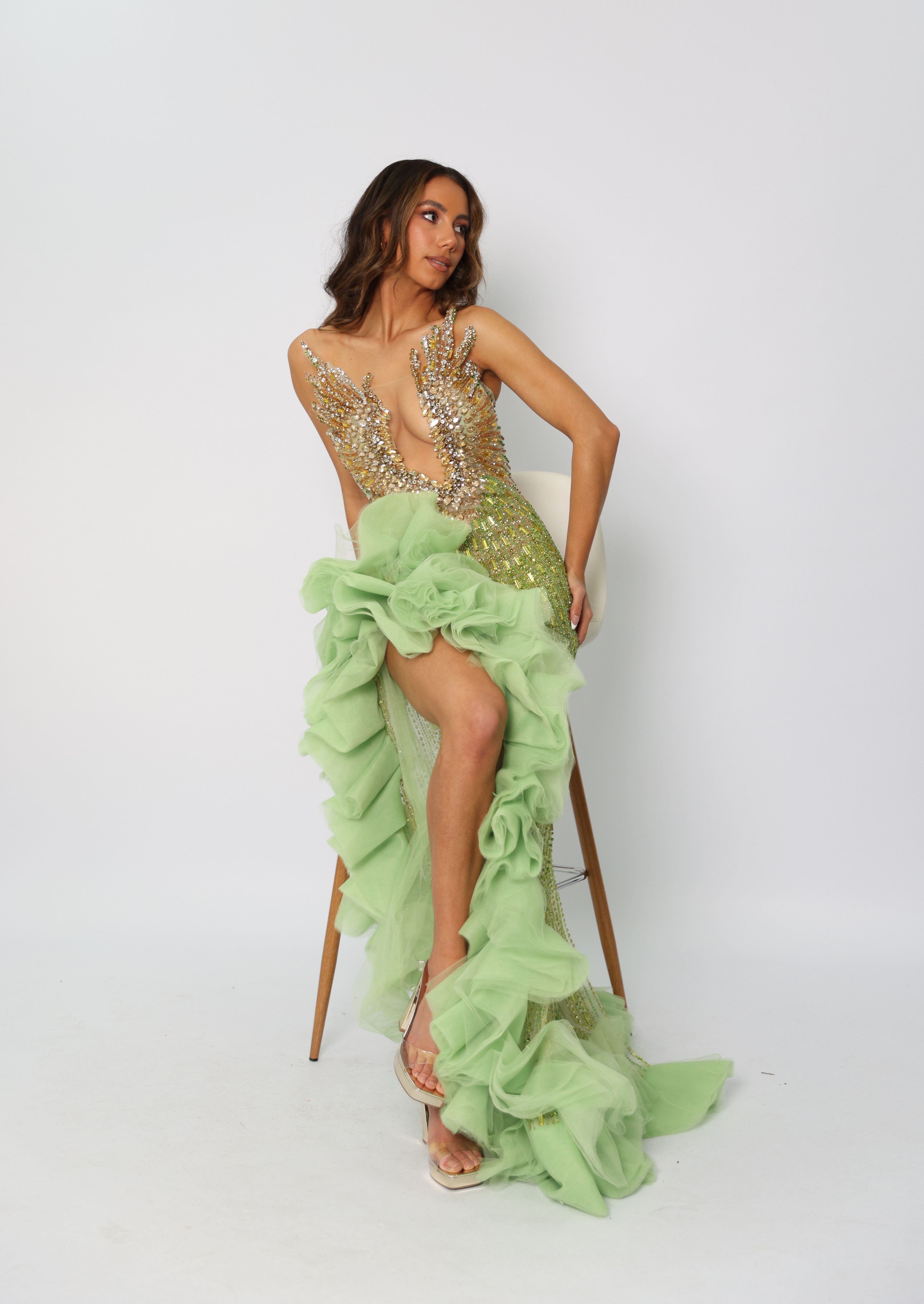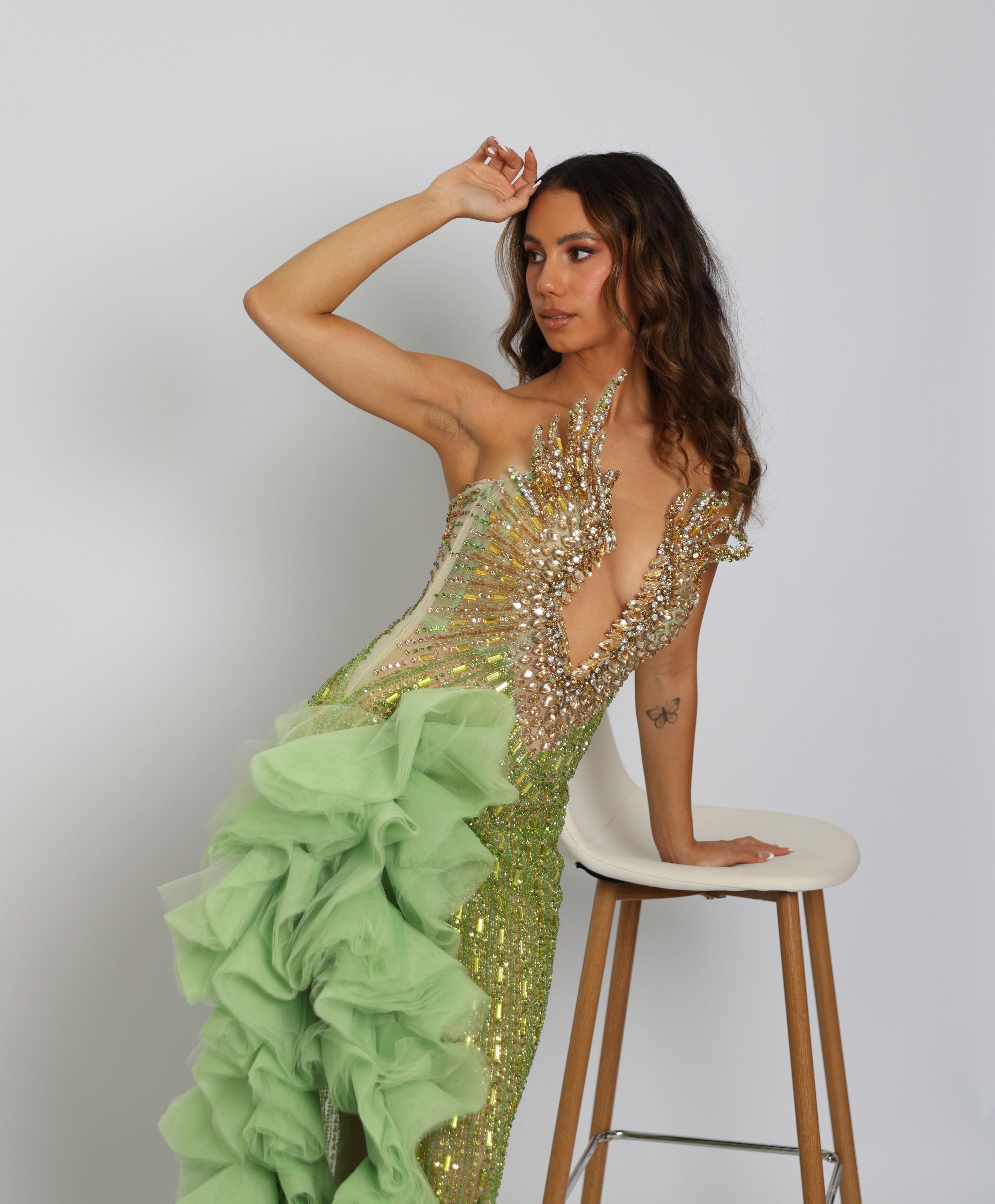 Shimmering green sequins that flow seamlessly into soft mint tulle ruffles.