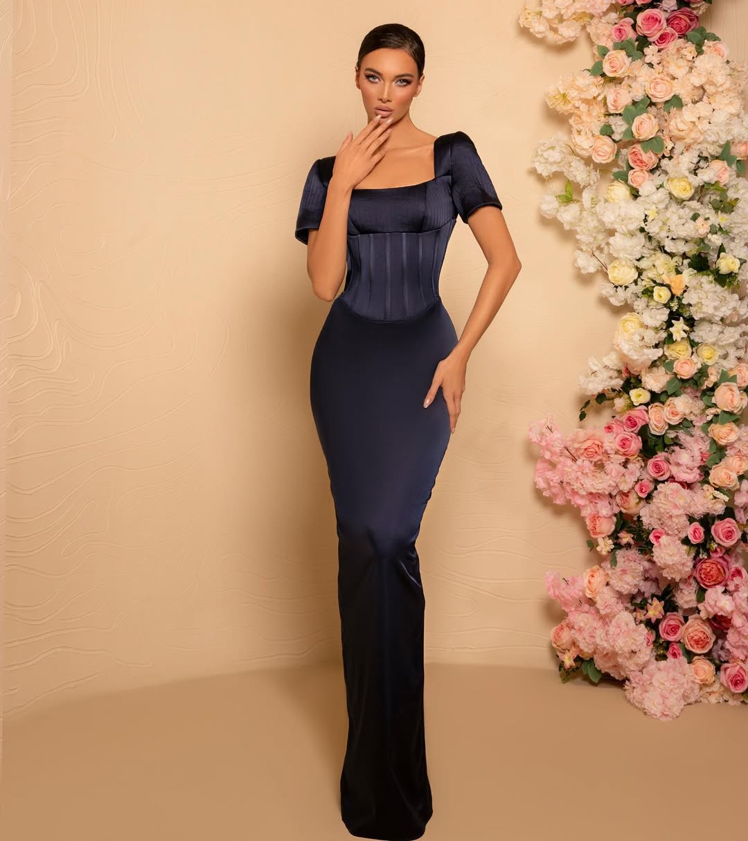 A statuesque navy blue gown featuring a structured square neckline, sculpted sleeves, and a corset waist that cinches beautifully into a floor-length hem.