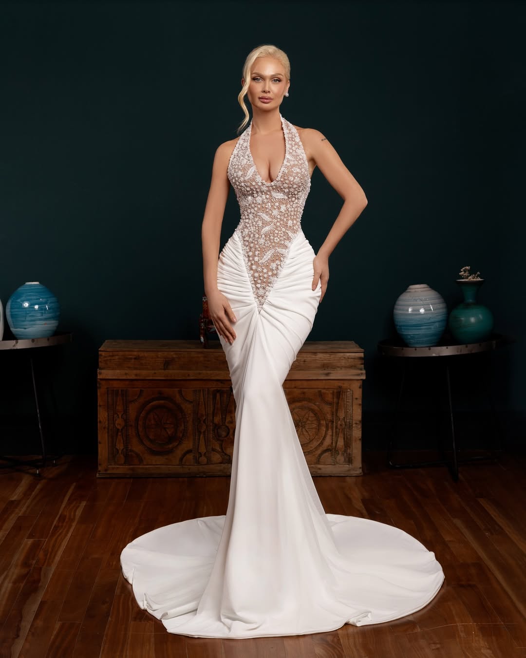 A sultry couture bridal gown featuring a halter illusion bodice richly embellished with floral beadwork, flowing into a sleek draped mermaid skirt with a soft train. Designed to contour the figure and create an elegant, high-fashion bridal silhouette.