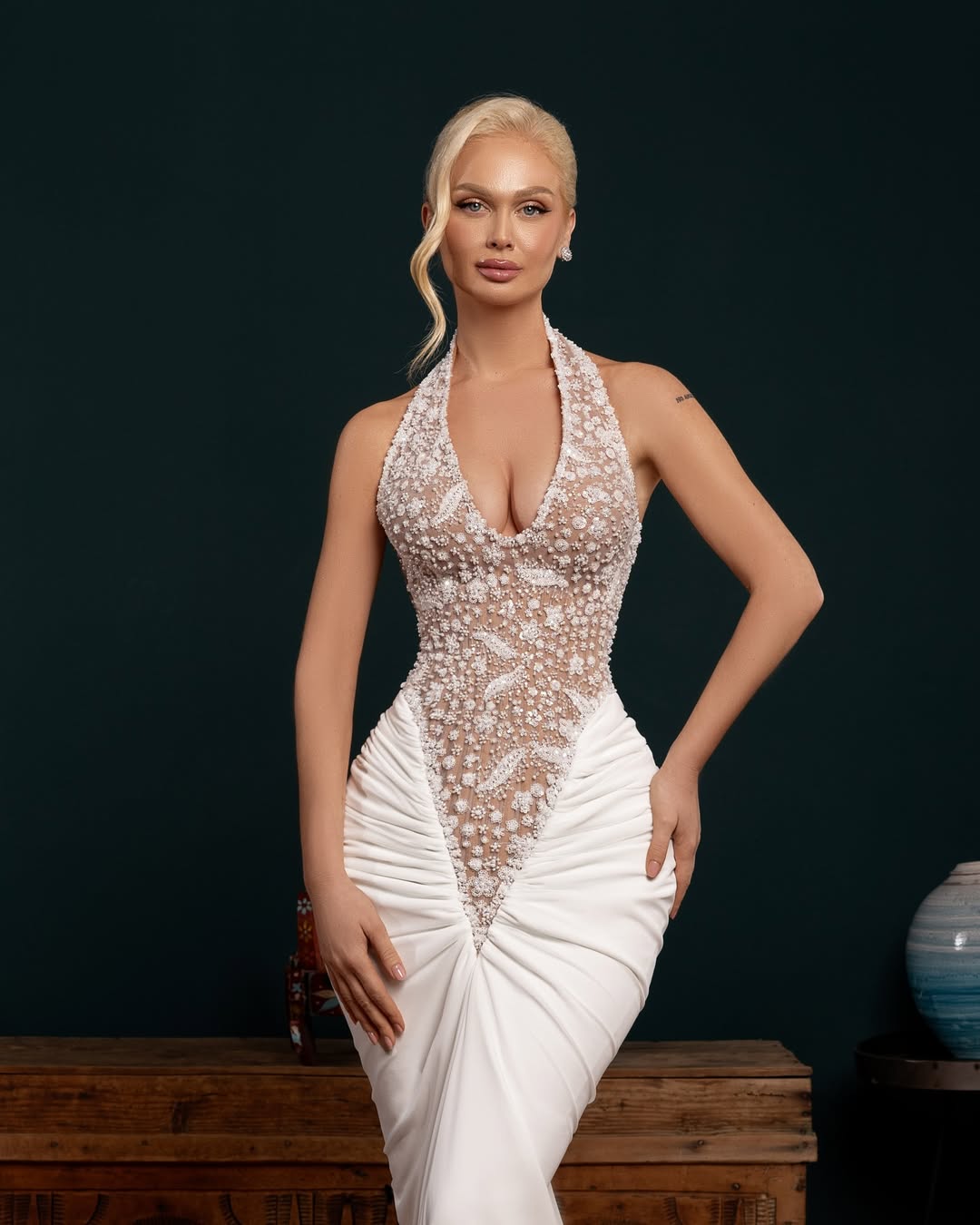 - Neckline & bodice: Deep halter neckline with sheer illusion paneling for a sculpted, modern couture effect.