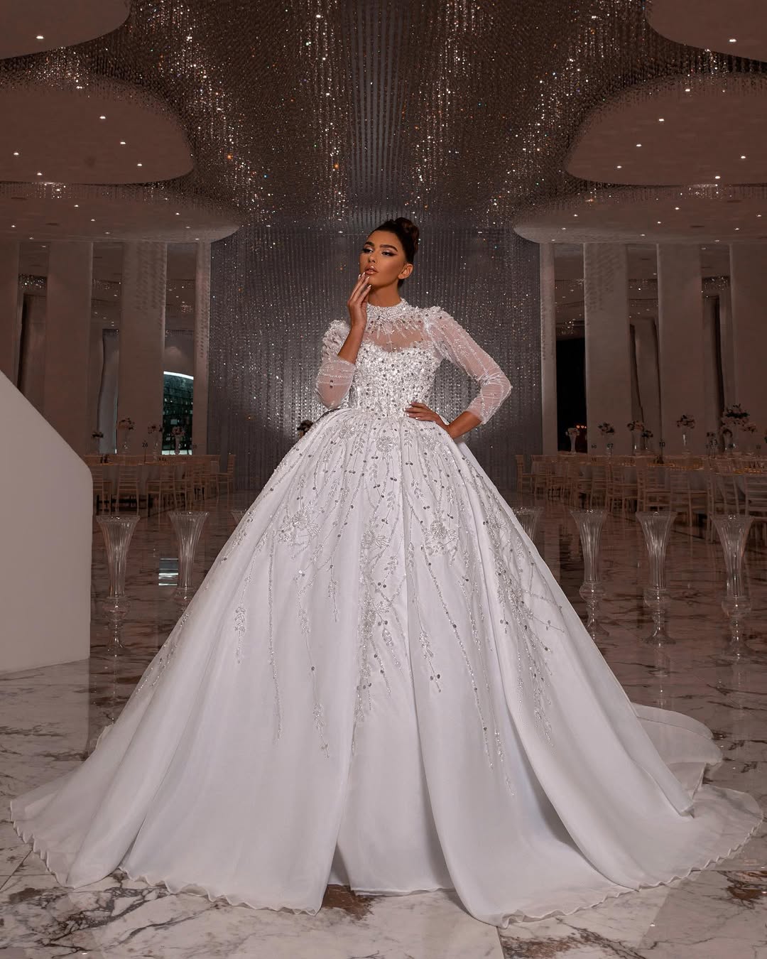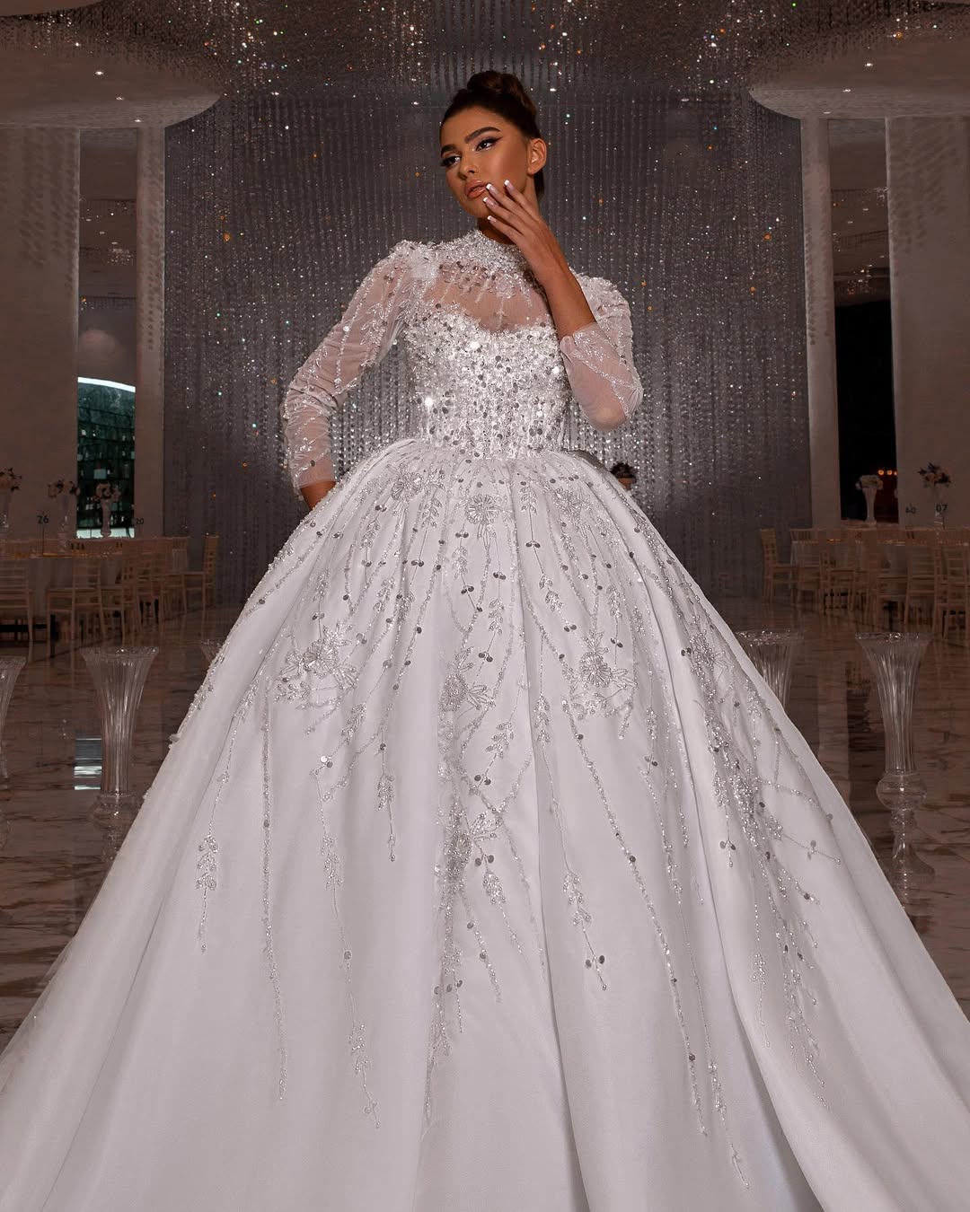 - High-neck ball gown with sheer illusion neckline and 3/4 sleeves