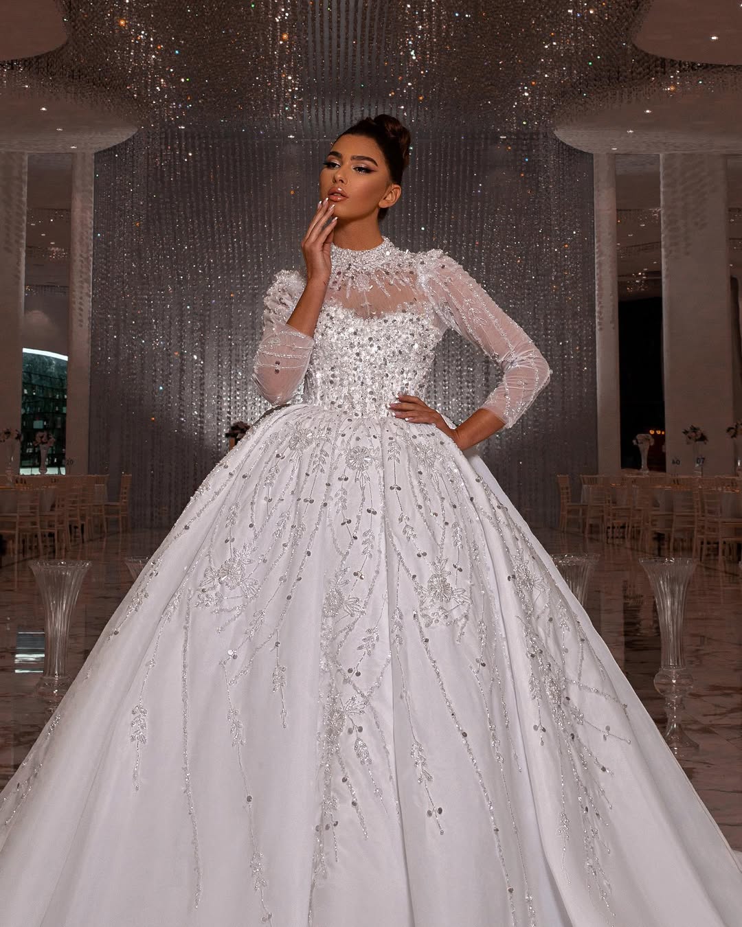Stunning wedding dress adorned with intricate lace and shimmering embellishments.