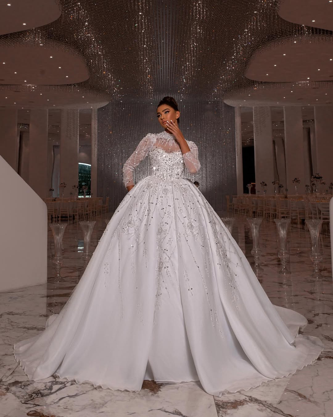 The bodice is fully encrusted with pearls and delicate beadwork, offering a regal touch.