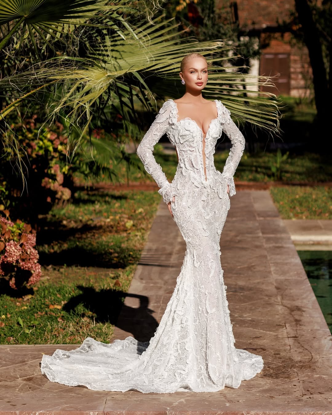 Fitted silhouette flows into a soft mermaid train, exuding refined sophistication.