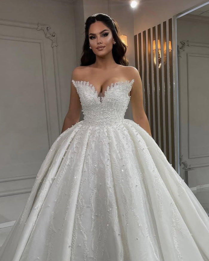 The bodice is fully encrusted with pearls and delicate beadwork, offering a regal touch.