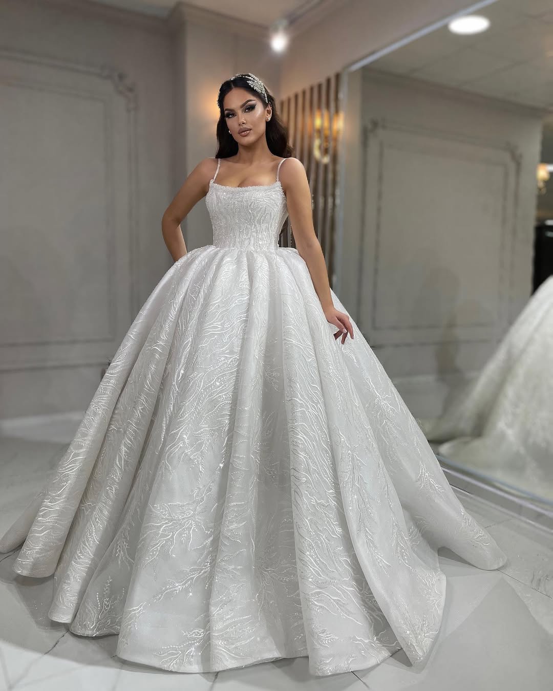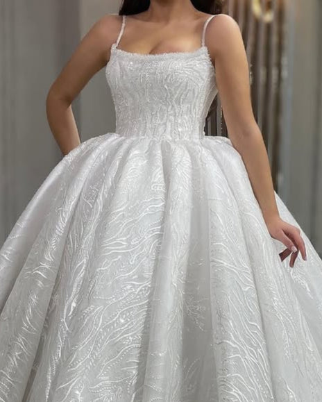Stunning wedding dress adorned with intricate lace and shimmering embellishments.