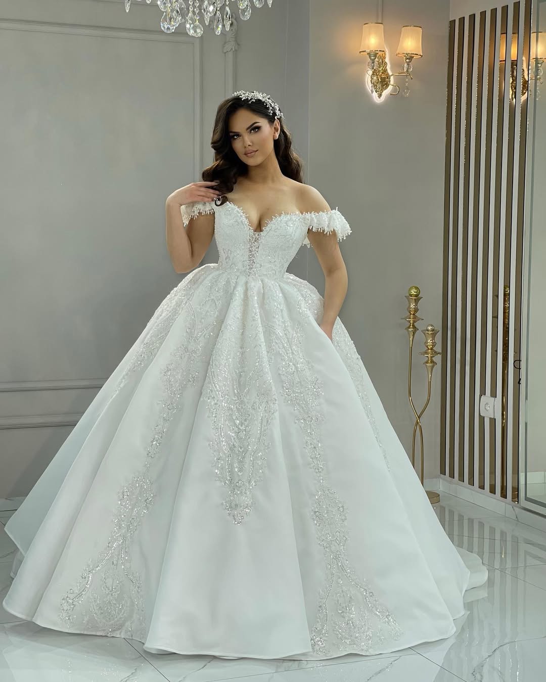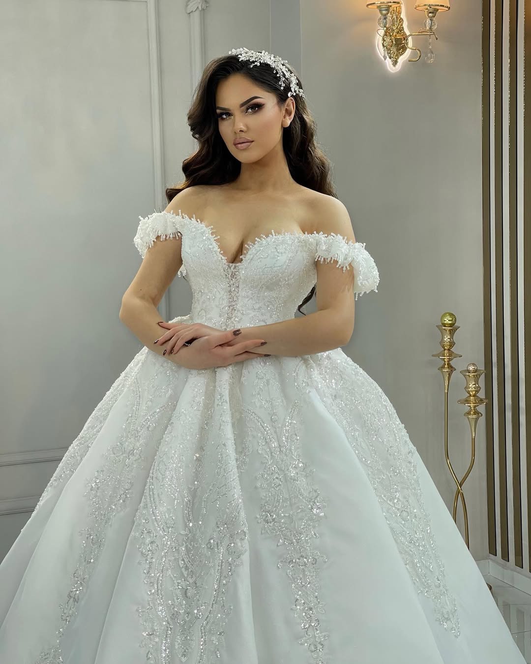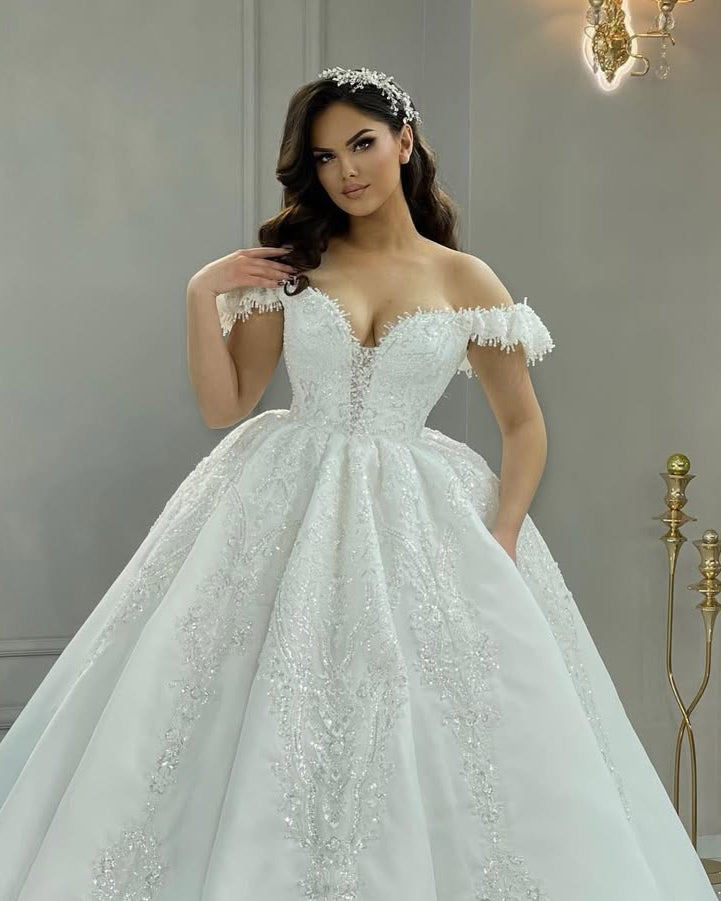 Stunning wedding dress adorned with intricate lace and shimmering embellishments.