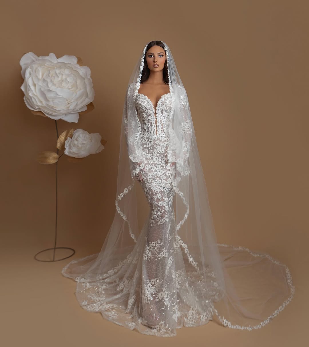 An ethereal masterpiece designed for the modern bride who embraces elegance with boldness. This fitted lace gown features a plunging neckline, long sheer sleeves, and an open back framed with delicate floral embroidery. The intricate lace continues through the full train, complemented by a cathedral-length veil for dramatic impact. Every detail celebrates femininity, confidence, and romance.