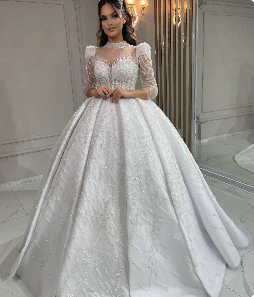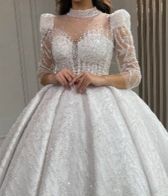 Stunning wedding dress adorned with intricate lace and shimmering embellishments.