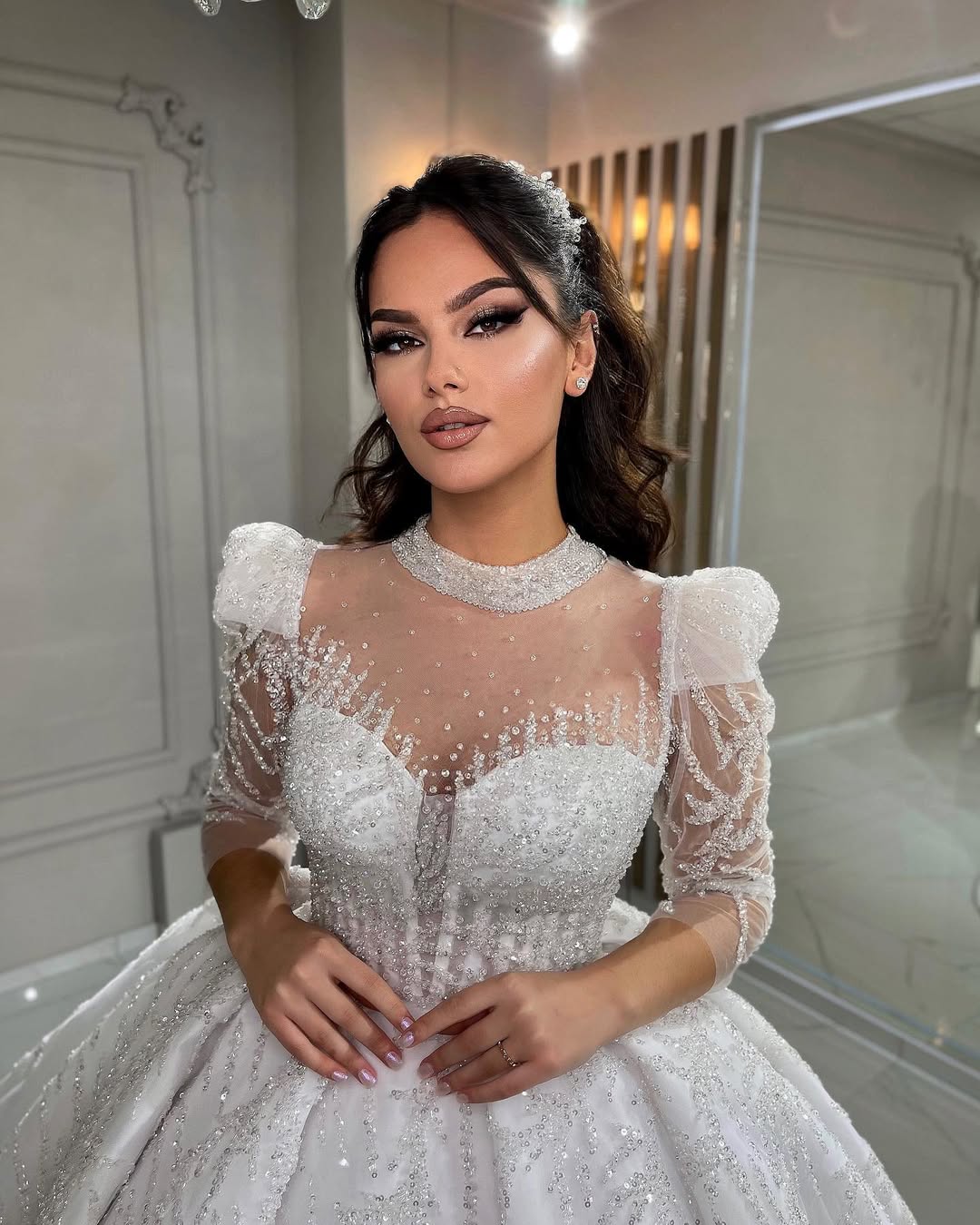 - Elegant veil with long sleeves. The upper part of the dress is made with beads which continue gracefully into the lower part of the gown