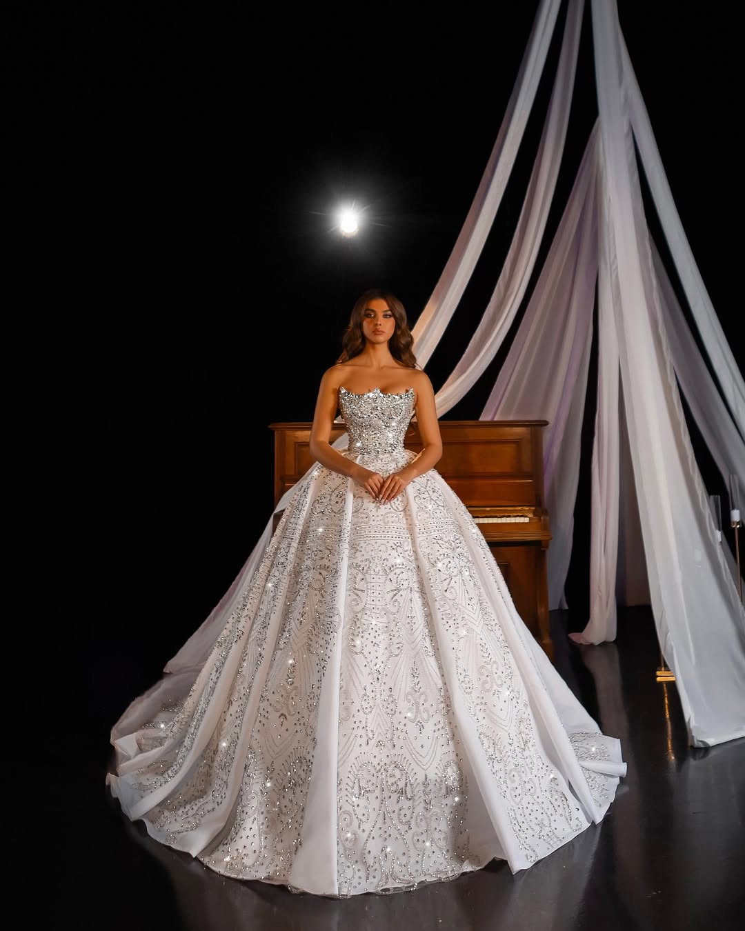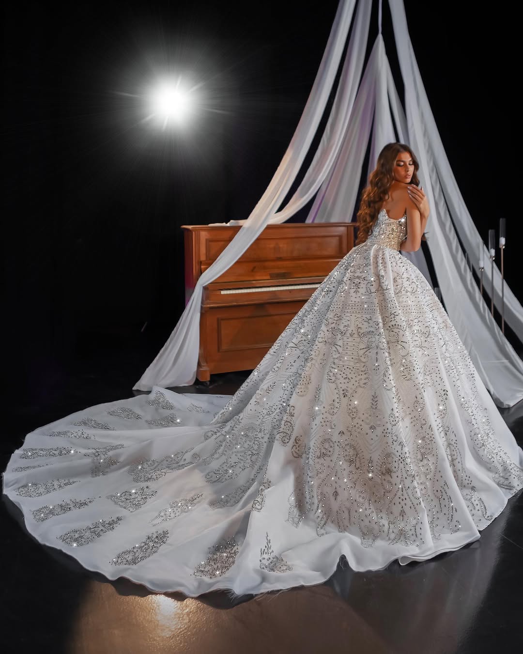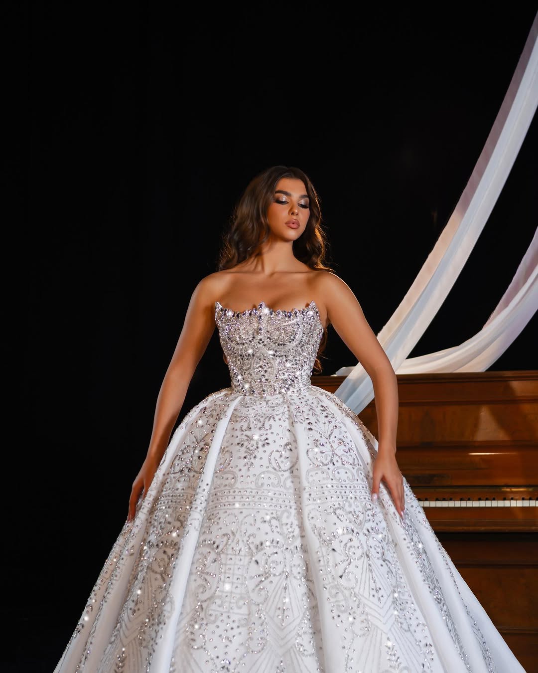 Each detail is meticulously placed to highlight the gown’s luxurious structure and movement.
