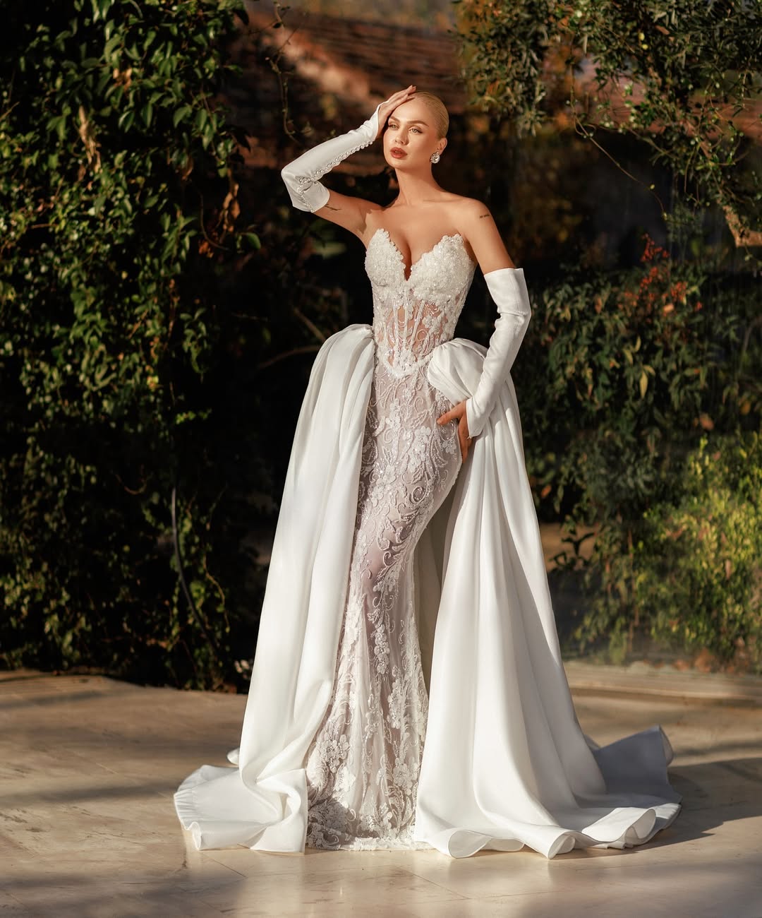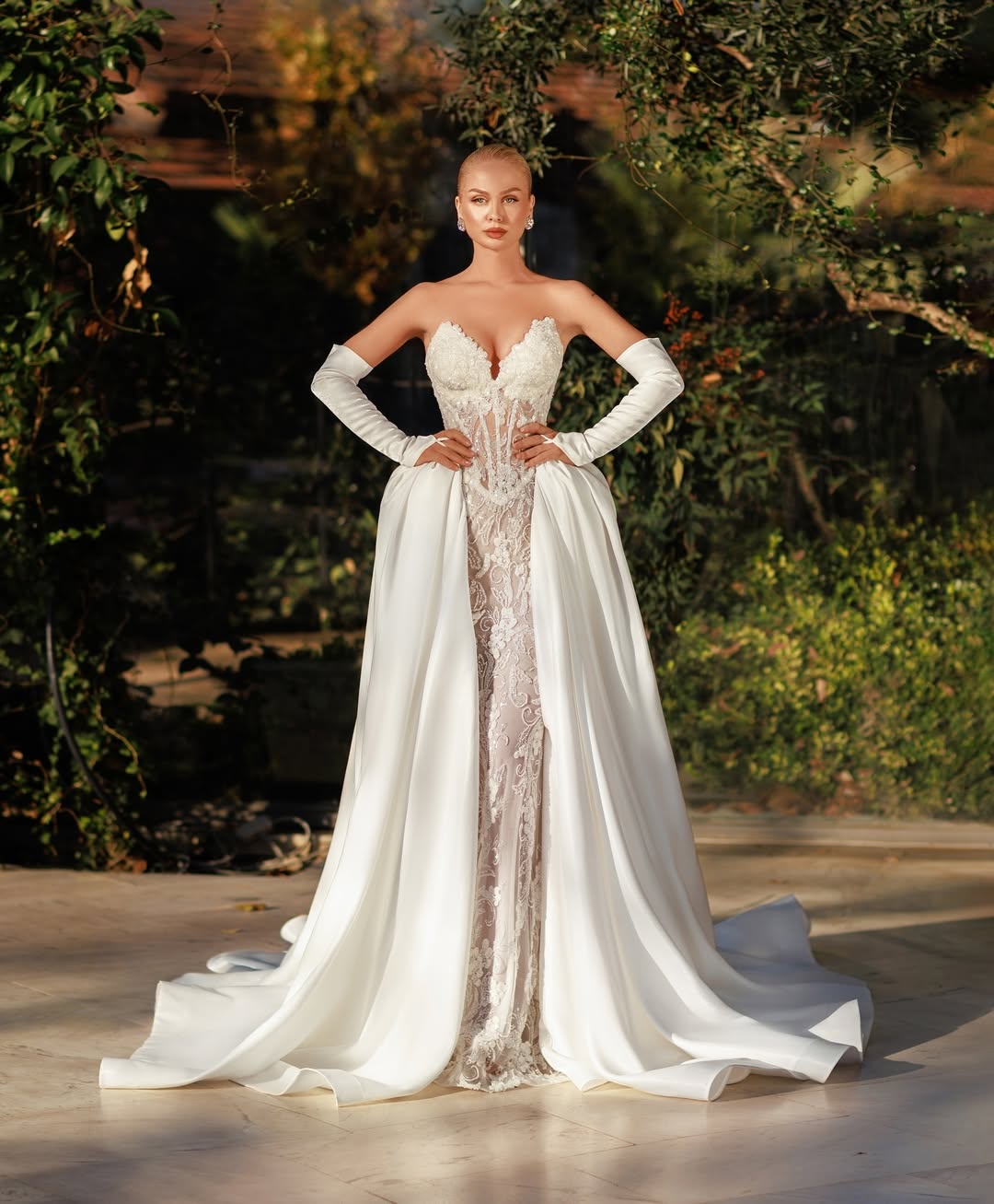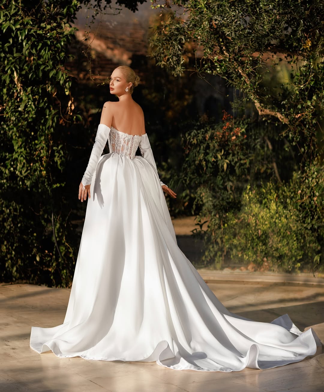 Long satin gloves and a flowing train add graceful drama to the silhouette.