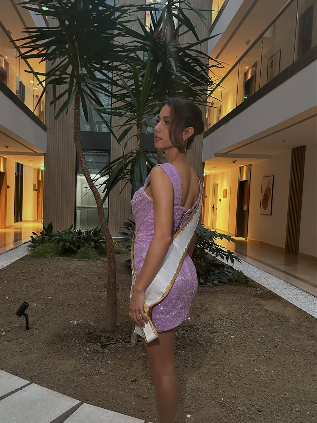 Dazzling lilac mini dress drenched in sequins, radiating brilliance with every step.