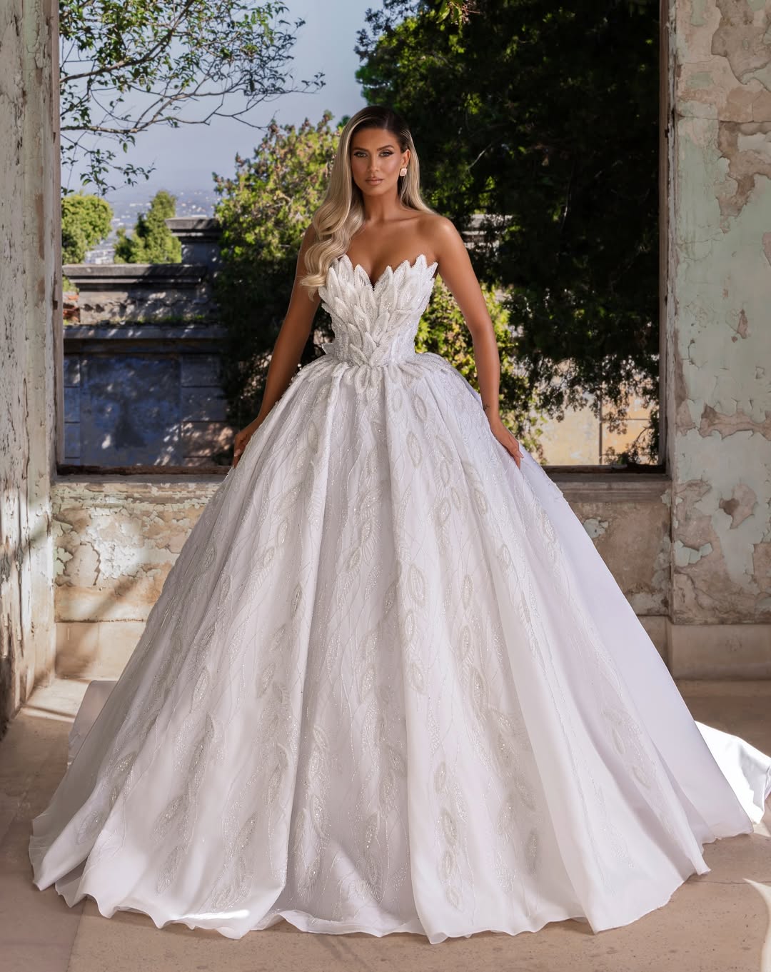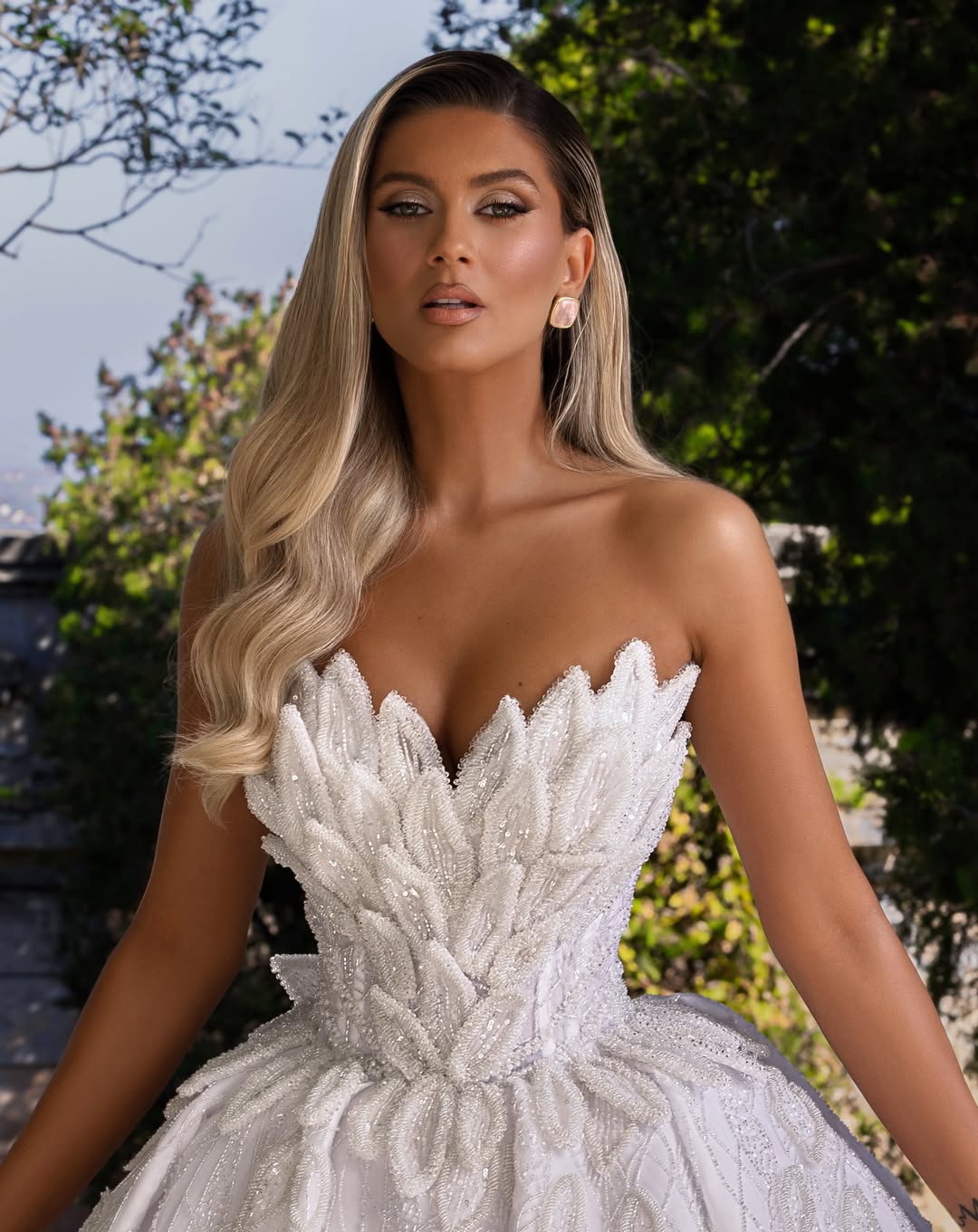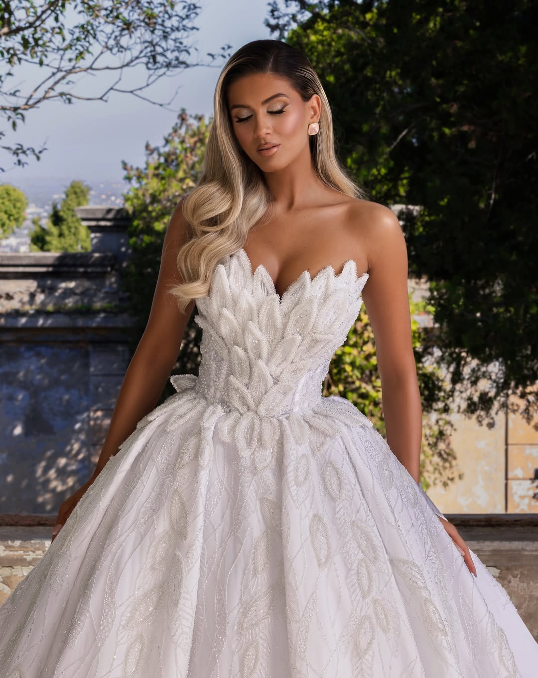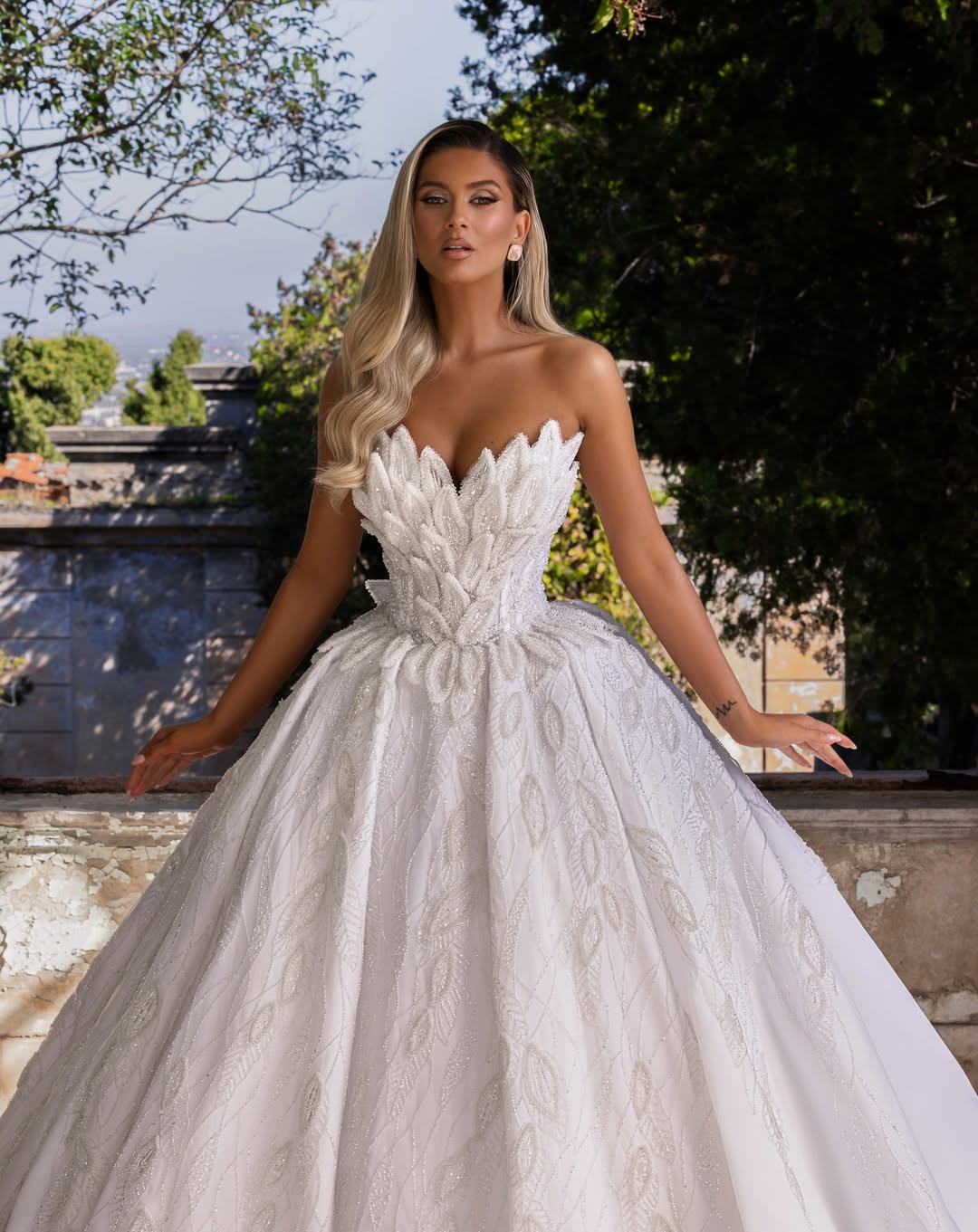 A romantic bridal ball gown with a sculpted strapless corset bodice blooming in leaf-like appliqués and soft sparkle. The full skirt flows in airy volume with shimmering botanical motifs for a modern fairytale finish.